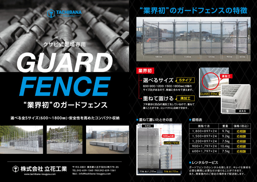 “業界初”のガードフェンス。選べるサイズ(5タイプ)600・900・1,200・1,800mmと5種類のサイズ別があるので、現場に合わせて使えます。