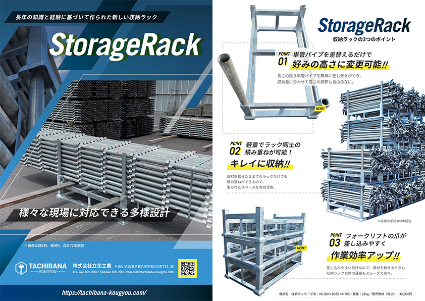 様々な現場に対応できる多様設計で、単管パイプを差替えるだけで好みの高さに変更可能、軽量でラック同士の積み重ねが可能でキレイに収納。フォークリフトの爪が差し込みやすく作業効率アップします。